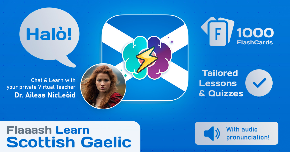 Master Scottish Gaelic with native audio flashcards, quizzes, games and your virtual private teacher Dr. Aileas NicLeòid, available 24/7.